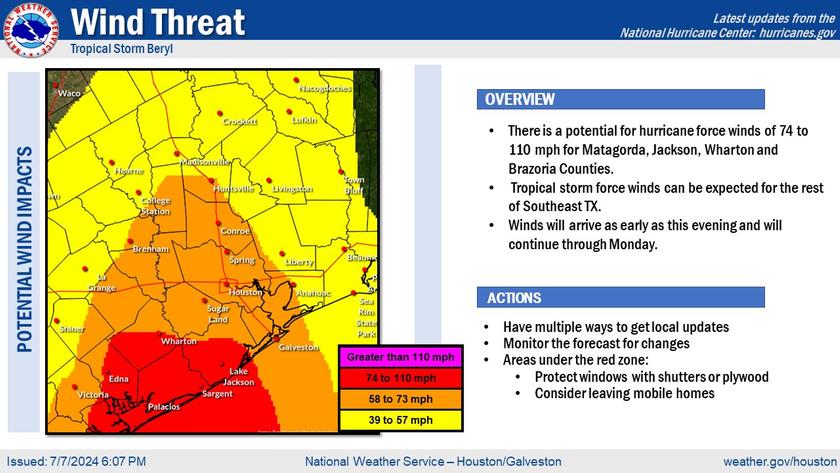 MONTGOMERY COUNTY, TX -- 6:15 PM CDT Update: Tropical Storm Beryl remains on track to produce strong winds, heavy rain, storm surge, and flooding across SE TX. Here are the latest updates on what to expect for each of these potential hazards.
