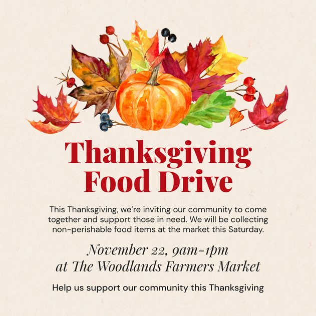 The Woodlands Farmers market is hosting a Thanksgiving food drive this weekend