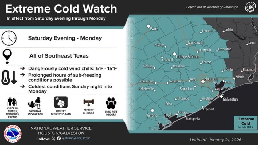 * WHAT...Dangerously cold wind chills as low as 5 to 15 possible, with the coldest values Sunday night into Monday morning. A hard freeze is also possible Saturday night and Sunday night with lows in the 10s to lower 20s. Some areas north of I-10 may remain below freezing all day on Sunday. * WHERE...Portions of south central and southeast Texas. * WHEN...From Saturday evening through Monday morning. Cold conditions may continue into Tuesday morning. * IMPACTS...Frostbite and hypothermia will occur if unprotected skin is exposed to these temperatures. An extended period of freezing temperatures could cause ruptured water pipes.