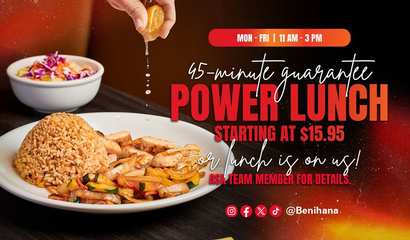 Introducing our NEW Power Lunch starting at just $15.95!* Enjoy a delicious hibachi meal within 45 minutes, or lunch is on us! Available Monday through Friday between 11 AM and 3 PM, in the dining room ...