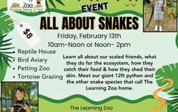 Open to homeschoolers and their families ONLY This month is All About Snakes! Discover the fascinating world of our scaled friends—how they help the ecosystem, hunt for food, shed their ...