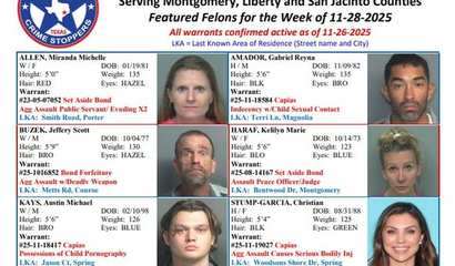 Serving Montgomery, Liberty and San Jacinto Counties. Featured Felons for the Week of 11-28-2025. All warrants confirmed active as of 11-26-2025.