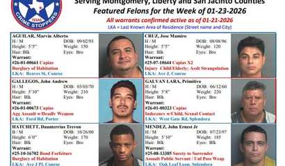 Serving Montgomery, Liberty and San Jacinto Counties. Featured Felons for the Week of 01-23-2026. All warrants confirmed active as of 01-21-2026.