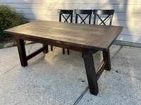 Two tone dining set with four chairs. This set was originally from Ashley furniture Woodanville model. I had this for about six years but very gently used. There are some scratches on the top of the table, but still in very good condition. The table has two leaves, and made with wood and engineered wood.