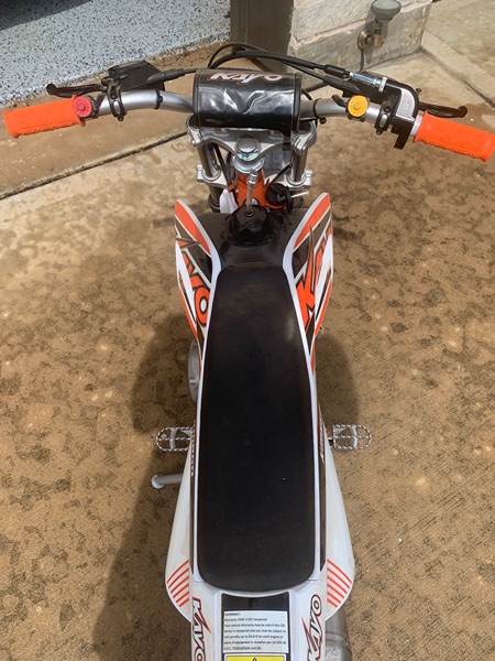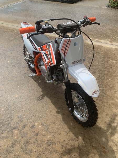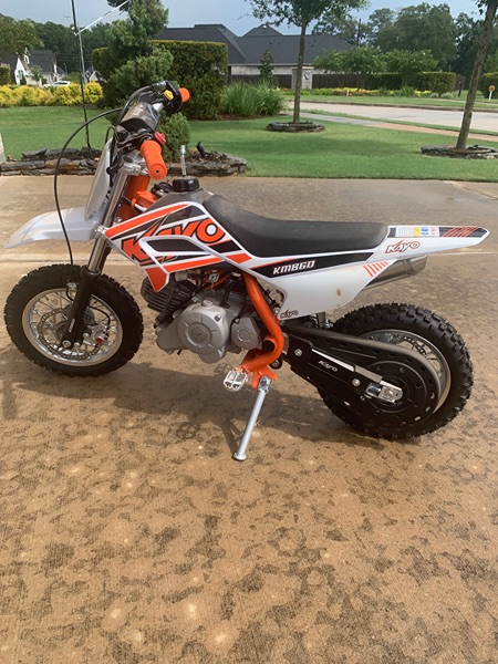 The KMB60 is a great beginner bike. 4 stroke engine fully automatic. Electric start. Disc brakes front and back. Light weight with seat height of just 22 inches. 92.5 lbs. chain drive. Go to ridekayo.com/kmb-60 for all specs. This bike is brand new, never been ridden. Won in a raffle contest. Easy porch pick up at my Creekside/Tomball home.