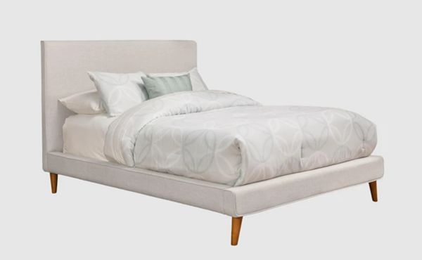 Selling a Brittney Light Grey Queen Upholstered Platform Bed (from Living Spaces – original listing here: link) along with a comfortable queen mattress.