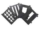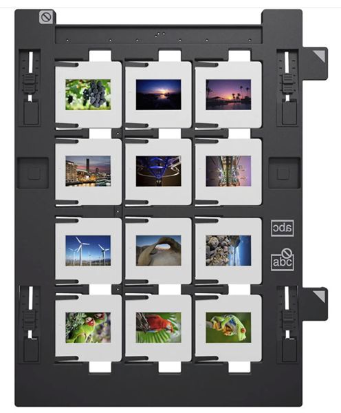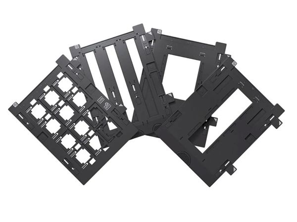 The 35mm slide holder accommodates up to 12 slides, 35mm film strip holder accommodates up to 18 frames (three strips, up to six frames per strip), medium format holder accommodates one film strip up to 20cm-long, and the 4 x 5" holder accommodates one 4 x 5" sheet.