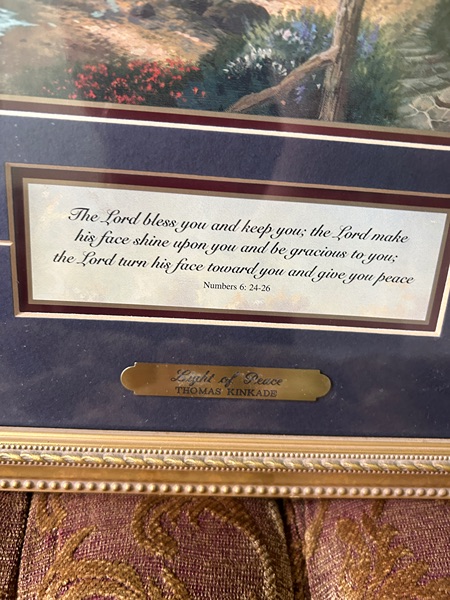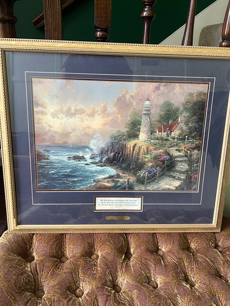 "Light of Peace" large print by Thomas kinkade. 26" by 22" I marked the price low as it as a slight damage on the bottom left corner of the frame as you can see in the picture. Otherwise very nice.