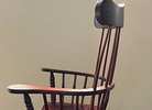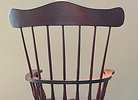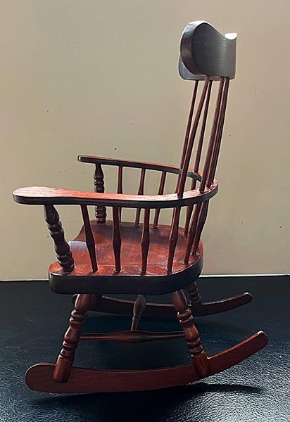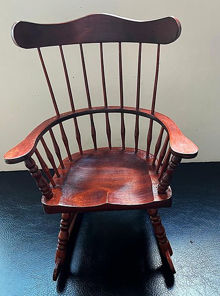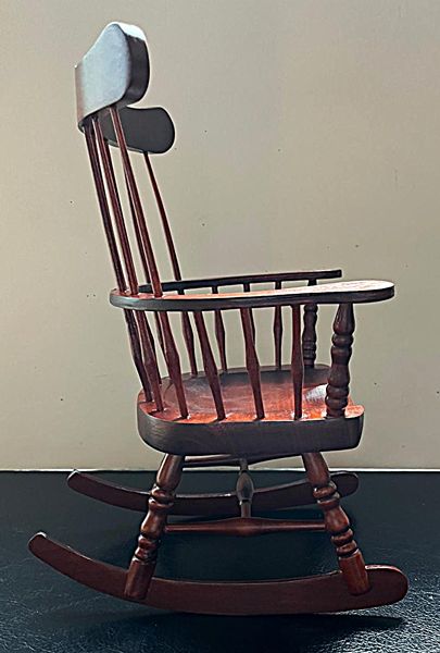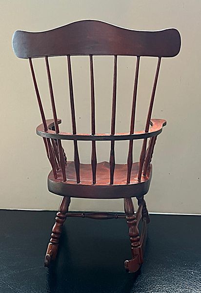 Rocking chair for 18-inch, or smaller, doll or stuffed animal. It is a Windsor style and solid wood. It has a cherry wood finish and measures 13" high x 8-1/4" wide. The seat itself is 5-1/4 wide and 5" deep. Was originally purchased for an American Girl doll.