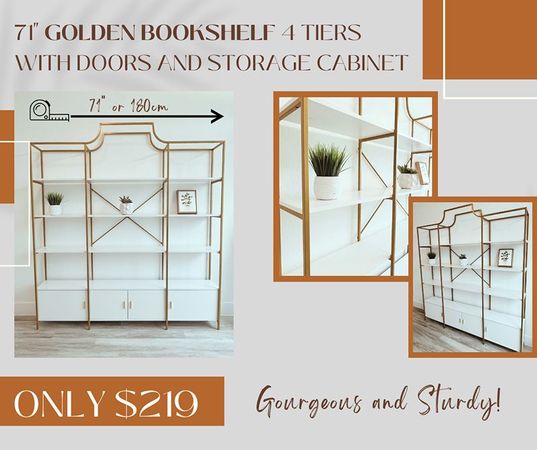 Elevate your space with this chic golden bookshelf that blends display and hidden storage. Four open tiers showcase books, plants, and décor, while the lower doors conceal a roomy storage cabinet for a clutter-free look. Sturdy metal construction with a smooth, glamorous finish. Compact footprint—perfect for living rooms, home offices, or bedrooms. Excellent condition: clean, stable, and ready to use. Dimensions: 71' (180 cm) height. Priced to sell at just $219. First come, first served. Pickup preferred; local delivery available for a small fee. Message to schedule a viewing today!