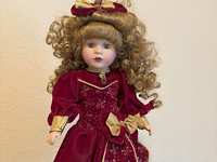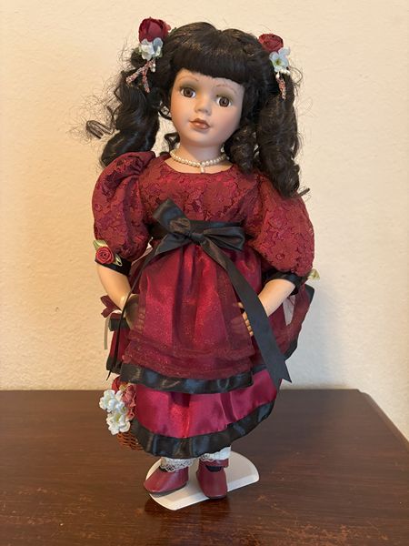 Victorian-style porcelain doll with dark, curly hair, adorned with flowers and ribbons. The doll is approximately 17-18 inches tall and is wearing an elaborate burgundy dress with black bow and accents. $20. Pickup location near FM 1488 and College Park Drive in The Woodlands.