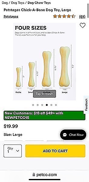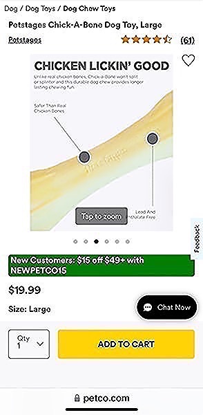 Chick-a-Bone by Petstages offers a safe and healthy alternative to chewing real bones, which can split and splinter, making them dangerous for aggressive chewers. This sturdy, dog chew toy has all the taste of real chicken, but is made from a blend of natural bone and synthetic materials free from lead or phthalates. This bone chew toy is a great way to encourage proper chewing habits when you don't have time to play, and can also be used outdoors. Available in 4 different sizes to fit any breed.