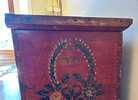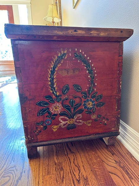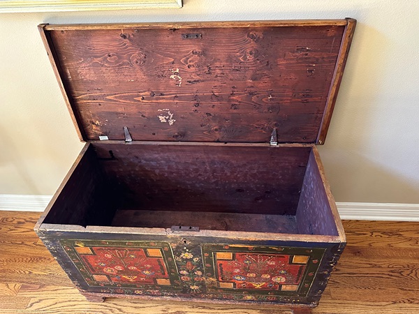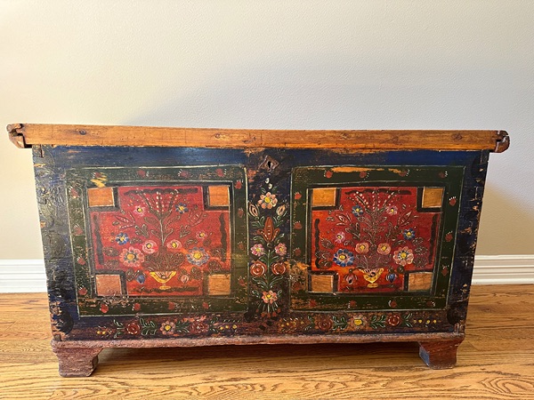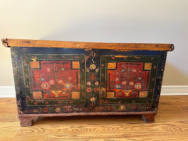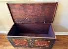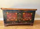 Beautiful antique blanket chest in rich colors.  Hand-painted and charmingly distressed. Would be great as a coffee table or at the foot of a bed.  Purchased many years ago from White and Day Antiques on FM 1960.  The proprietor said it came from Europe.  Dimensions 44" long  by 20" deep by 24" high.