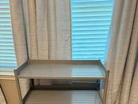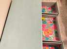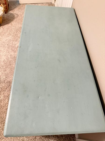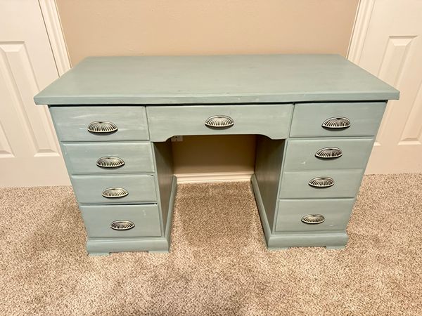 Nice wooden desk. It was finished in Annie Sloan chalk paint with a white wax finish. The top needs to be touched up, but overall the desk is in great shape. The drawers are all lined and sealed with watercolor paper for a pop of color. Comes from a smoke free / pet free home.