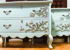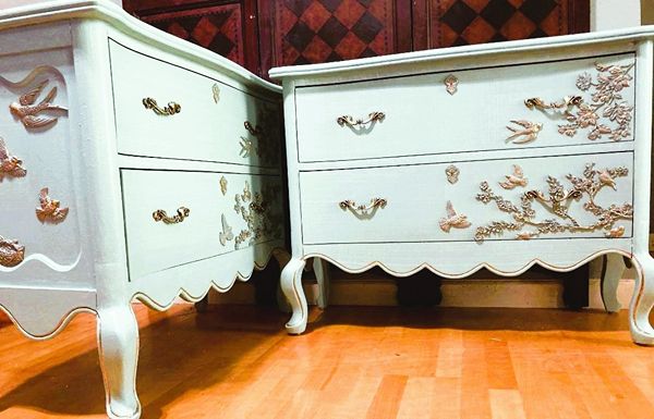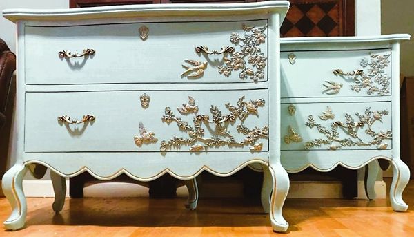 - We cleaned, filled, sanded, primed, added worn linen texture paint and glazed in layers, hand poured and applied moulds of birds and branches and florals, then, gilded and sealed for durability.
