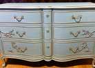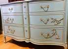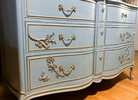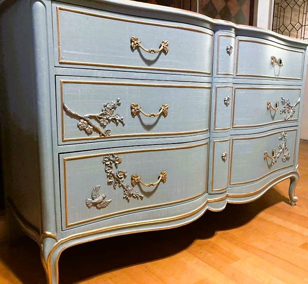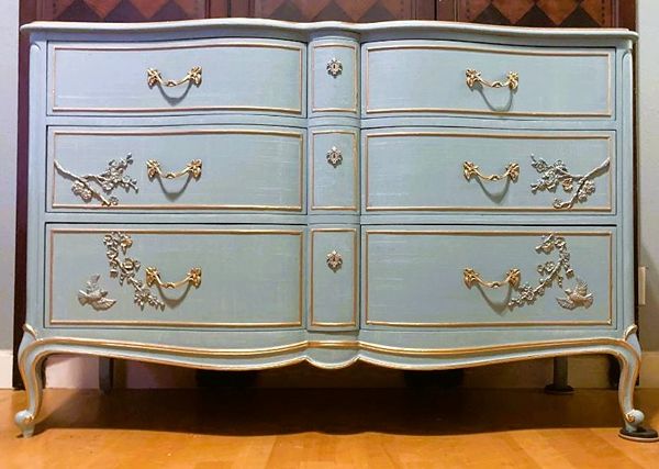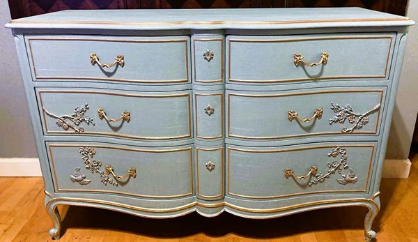 - We cleaned, filled, sanded, primed, added linen texture, painted in layers,  I hand poured bird and branches molds, painted and gilded them then sealed the entire dresser for durability.