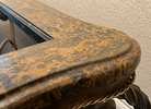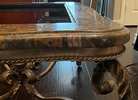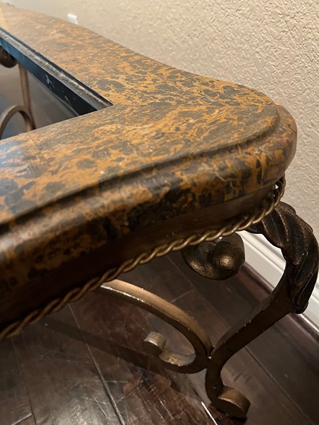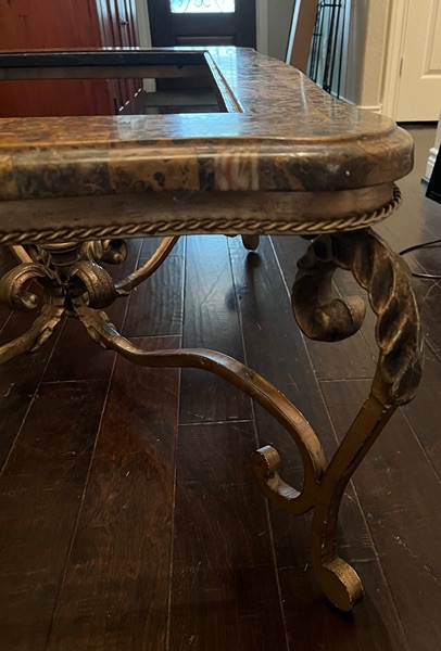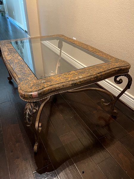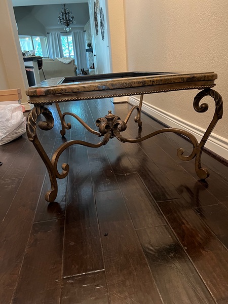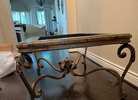 Beautiful stone top rustic wrought iron coffee table. Glass top. Very sturdy and has some weight to it.