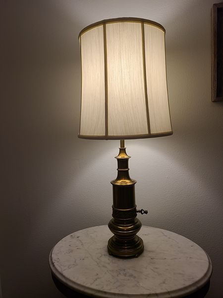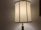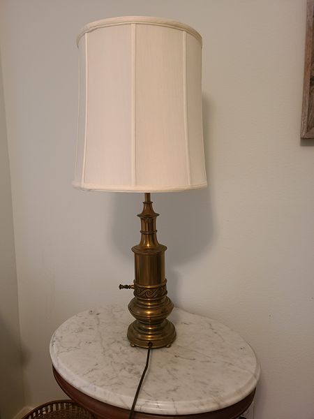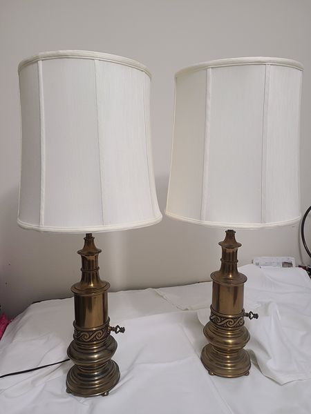 Set of brass lamps in perfect condition. Has turn switch and base key switch. Measures 32'H. Shade 14' W.