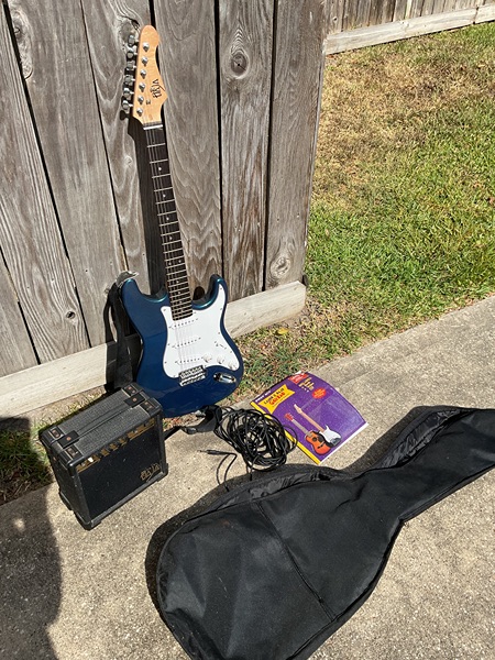 Beginner electric guitar, amp, instruction book, cover