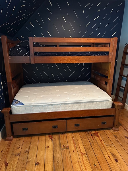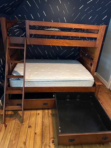 Solid wood twin-over-full bunk bed in great condition — durable, clean, and perfect for kids, teens, or a guest space. Includes large under-bed storage drawers and matching dresser & mirror.