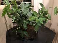 Measures 25 inches tall. Has brass base. Pretty design on lamp shade panels. Very good condition. Asking $12.00.