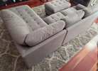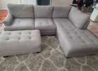 Grey fabric couch with chaise. With Ottoman. Dim: back to end of chaise-78'. Back to end of couch-38'. 101' long. Ottoman-W-24'L-38'. Normal wear. No rips or tears. Easy assembly. No pets. No delivery. COH.