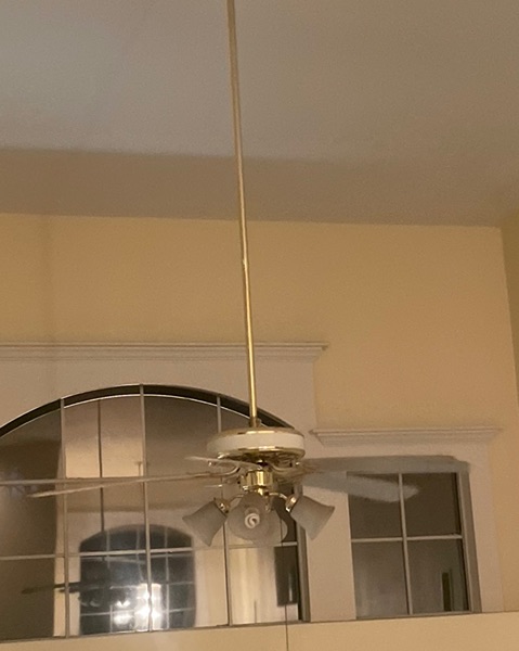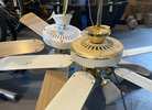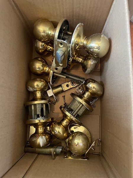 Gold door indoor knobs, privacy lock / non locking, 3 gold trim fans with lights, all in good shape replaced when remodeled house. Ceiling fan with downrod 3-6 feet. Gold trim fan example attached