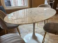 Dining table with 6 chairs. Table has scratches and wear. Chairs need to be cleaned.