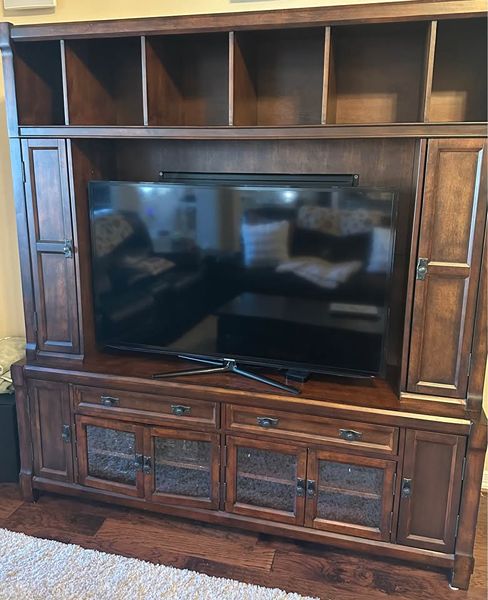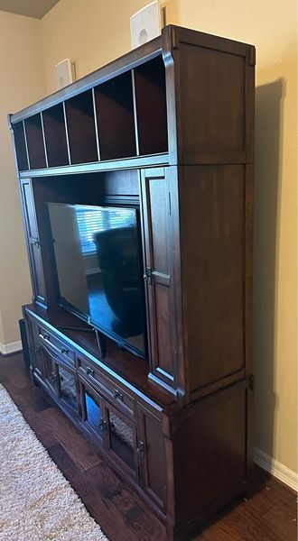 Ashley Furniture, solid wood, and fits up to 55” TV. Lots of storage, and built in TV mount for optional mounting. Great condition. A few nicks but otherwise perfect. Pickup only. Spring/Woodlands area.