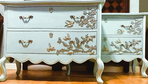 - We cleaned, filled, sanded, primed, added worn linen texture paint and glazed in layers, hand poured and applied moulds of birds and branches and florals, then, gilded and sealed for durability.