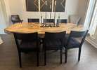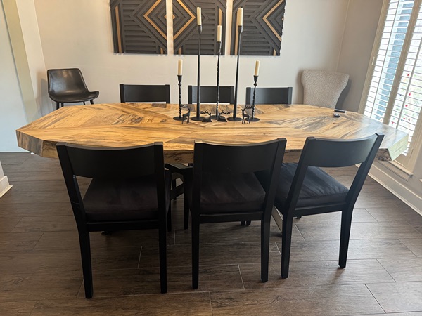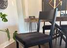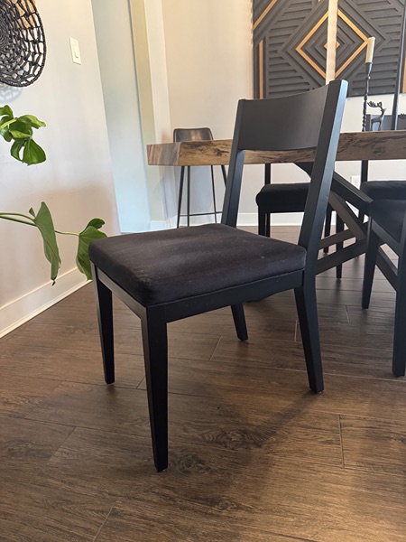 Purchased set of 6 custom chairs for $2700 from Ethan Allen in the woodlands. These are like new and have barely been used over the last 3 years. They are the Krain Dining side chairs in black wood with a custom Crevan Pirate-Black fabric.