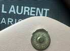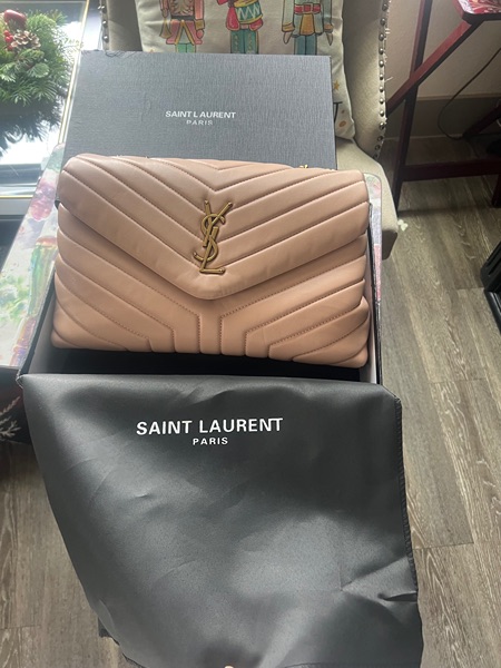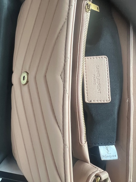 This SAINT LAURENT like Calfskin Y Quilted Monogram Medium Loulou Chain Satchel . This elegant shoulder tote features chic chevron quilted calfskin leather. The bag has a gold chain link shoulder straps with matching leather shoulder pads. The frontal flap features a prominent gold YSL monogram detail and opens to a partitioned black fabric interior with a pocket. Like new.