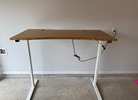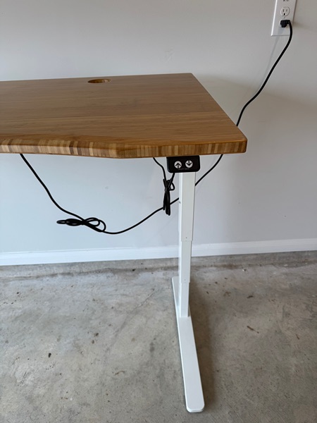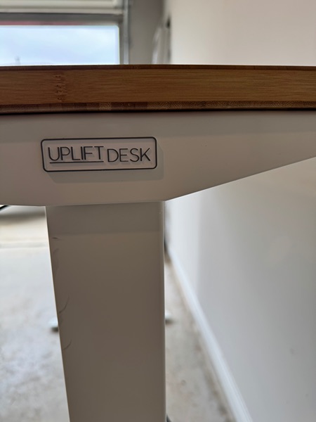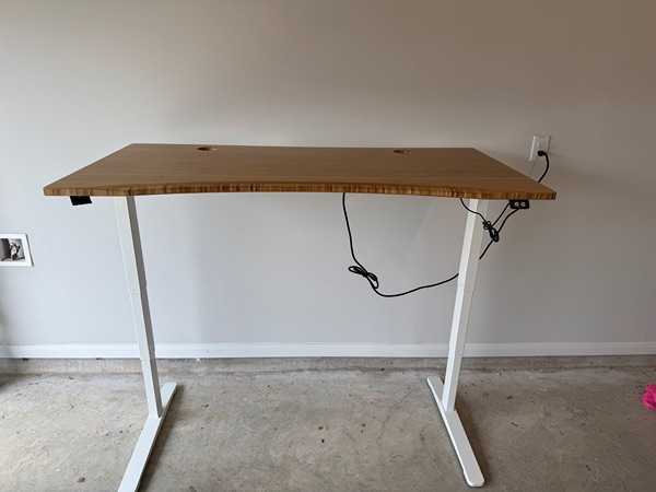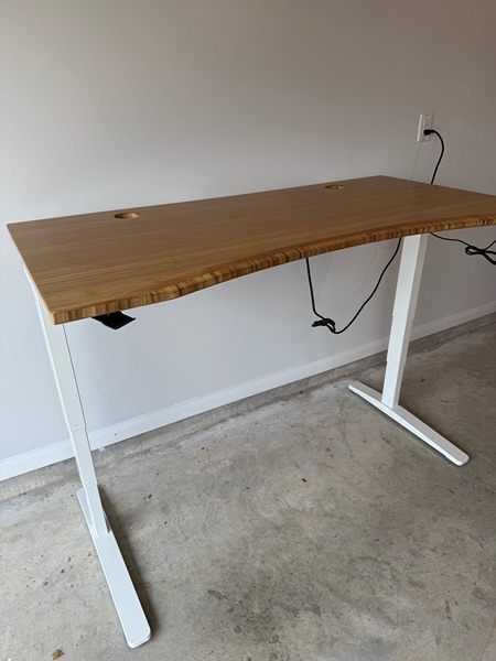 Excellent standing desk by uplift, electric smooth quiet and adjustable to the exact height you like. Solid, metal frame, bamboo top. It is scratched from the move and I have not researched if it is sandable. No longer working from home and smaller home so selling.