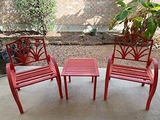 Charming and sturdy wrought iron chairs with side table and cushions. Excellent condition.