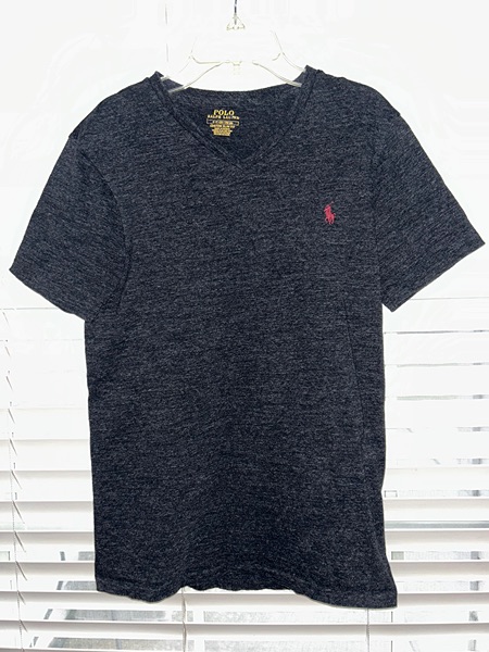 Men's small, slim fit v-neck, in heather charcoal. The embroidered logo appears red in the pictures, but it is actually a darker burgundy color. Excellent condition from smoke free home. $10