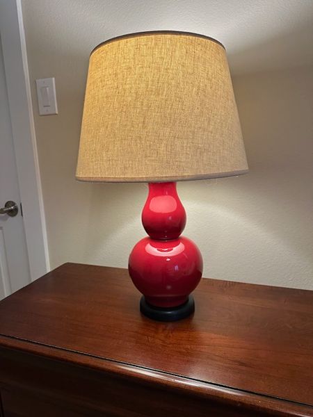 Beautiful, stylish table lamp from Pottery Barn. Cinnamon color with natural linen shade. Overall height is 24". Shade is 15" at bottom and 11" at top. Smoke free and pet free home.