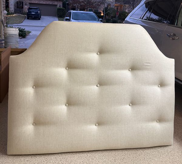 FREE. upholstered headboard hangs from D rings on wall. Cream linen fabric.