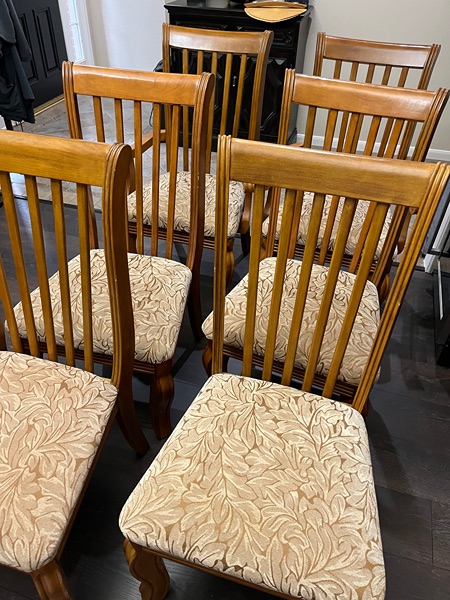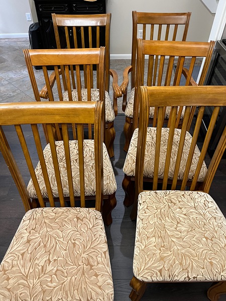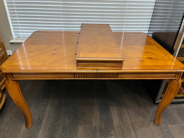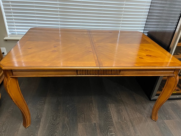 Used Set: Dining table, leaf insert, 4 armless chairs, 2 arm chairs. No stains or rips in seats. Table is 42 inches deep, 63 inches long (without leaf insert). Leaf insert adds 15 inches for a total table length of 78 inches. Easy pickup though front door and I will help. Located near TWHS on Research Forest. Cash, Zelle, or Venmo.
