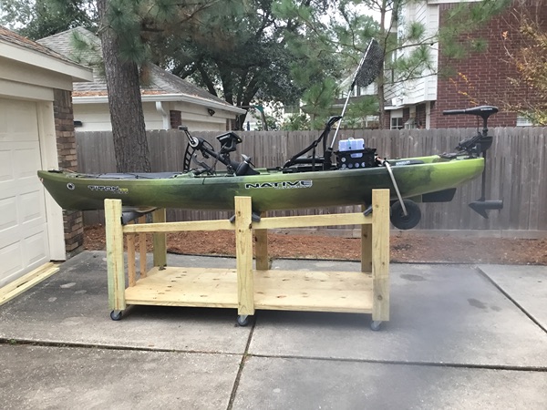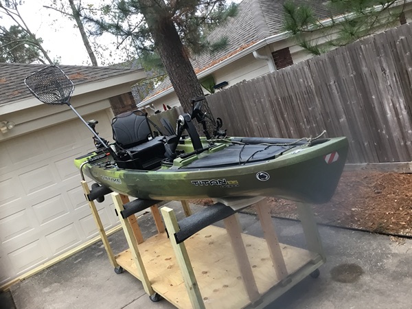 Also comes with a storage unit that is at the correct height to easily slide in and out of a full size pickup bed. This kayak has been garage kept so no weathering issues. The storage unit allowed me to wheel around the garage and have extra storage below.