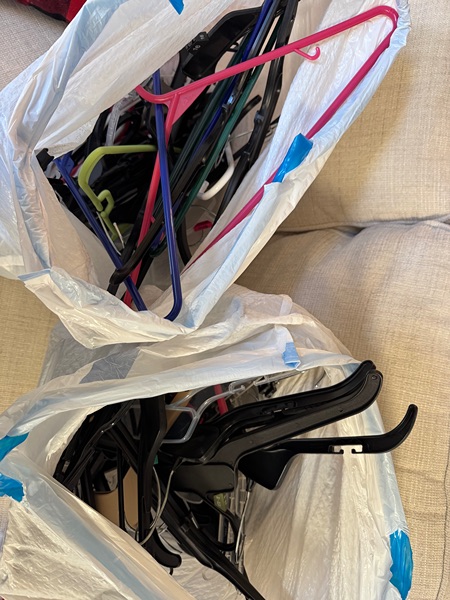 Two trash bags full of various plastic adult hangers. Porch pick up in Windvale neighborhood.