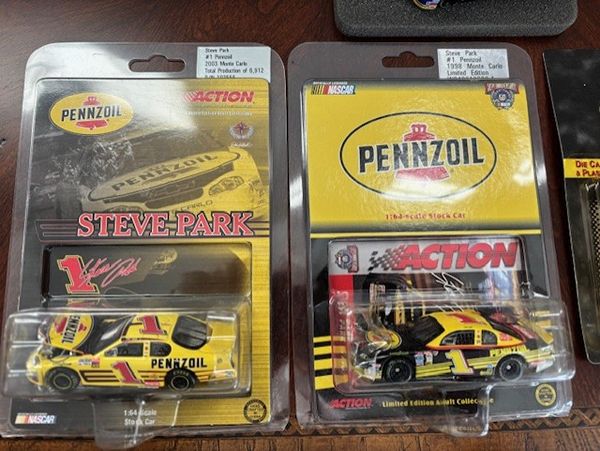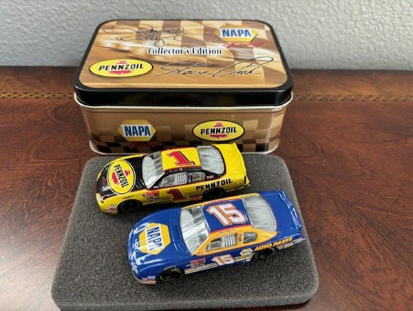 Small collection of NASCAR Collectibles includes Commemorative tin with #15 Michael Waltrip NAPA and #1 Steve Park Pennzoil cars, 4 other unopened blister packs. $15