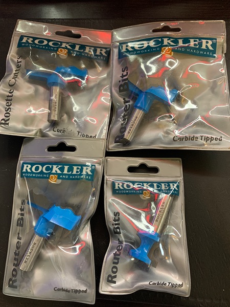 For sale are four unused Rockler router bits with 1/2" shanks. Manufactured with K20 tungsten carbide-tipped blades sharpened with a 600-grit diamond wheel. Three are rosette cutters (#24840, #24847, and #24854) and one is a bullnose bit (#32545). All are in new, unused condition in their original packaging and are very sharp. $10 each or $35 for all four. Thank you.