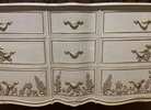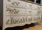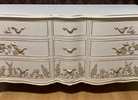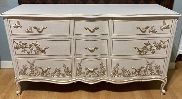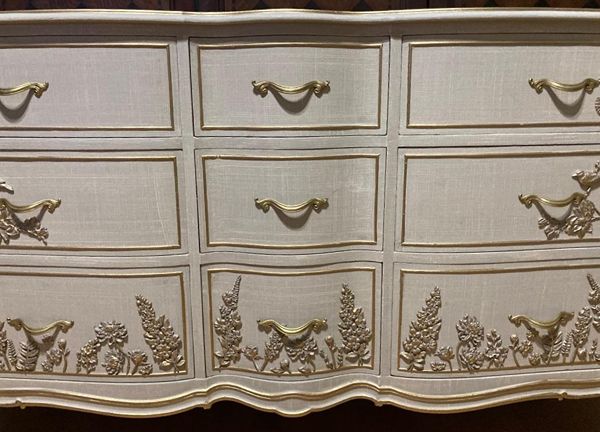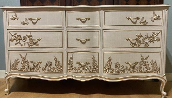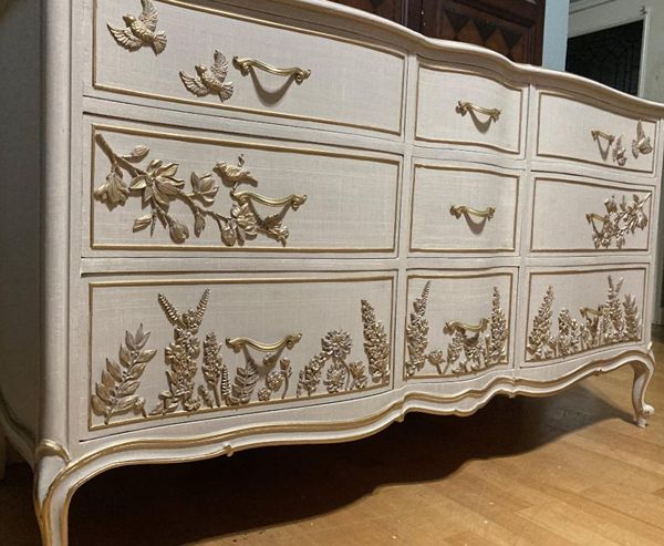 - We cleaned, filled, sanded, primed, added worn linen texture paint and glazed in layers. We hand poured molds of flowers and birds and composed them on the drawers. We layered the glaze in soft neutral beige color then gilded the molds and highlighted the trims. Then we sealed with polycrylic for durability.