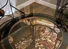 Excellent condition. 50-inch round and 3/4' thick tempered and beveled glass tops sits on a decorative pedestal base visible through the glass. Matching 5 upholstered chairs and baker's rack. Baker's rack is 20' deep and 42' wide. Very sturdy.
