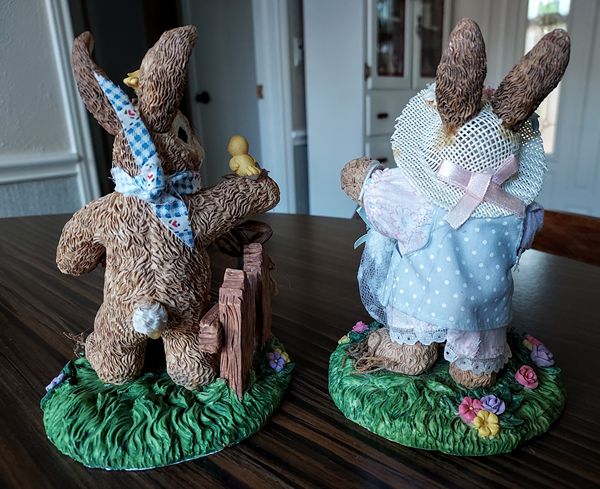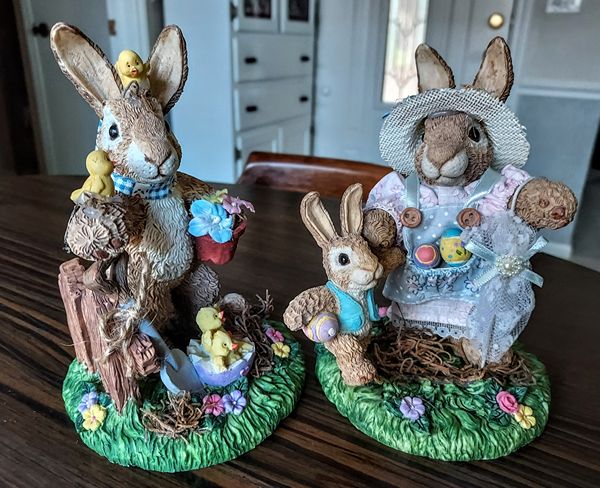 Charming bunny family trio just in time for Easter/Spring holidays. They are ornate, well made and in excellent condition. Housed in a smoke-free environment and well stored when not on display. The tallest statue measures aprox. 6" - 7" tall. Reduced price is $12 - cash only. If interested, please text or call 281-825-9606. Thank you.