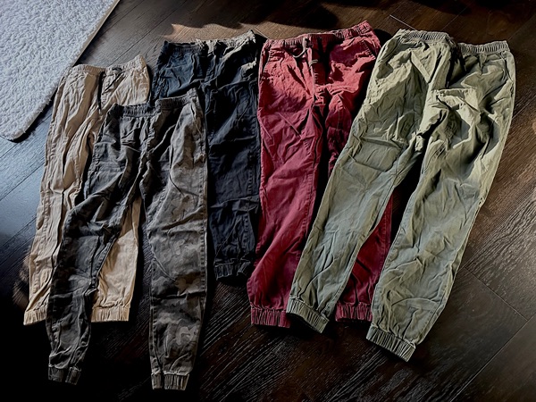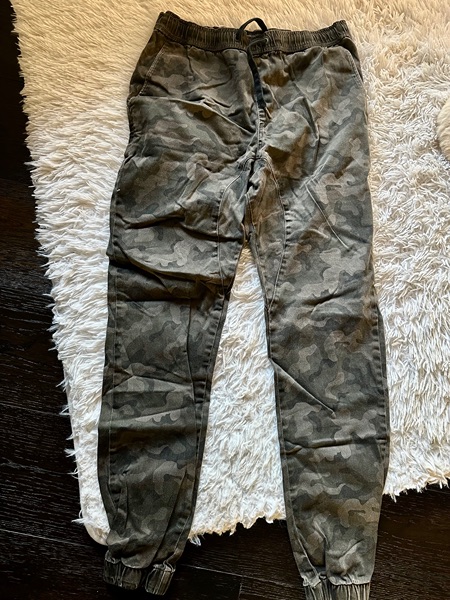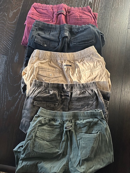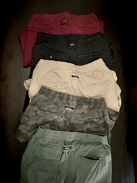 5 pair of men's Zanerobe brand joggers. Size 34 waist. Very nice quality, heavy cotton fabric. Only slightly worn and in excellent condition! The colors are dark burgundy, navy, khaki, olive green, and camo. I paid $130 for each pair. Selling them for $25 a pair. Located in The Woodlands.