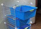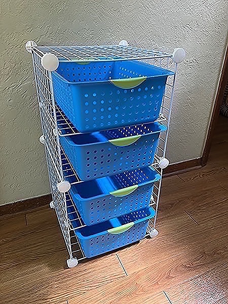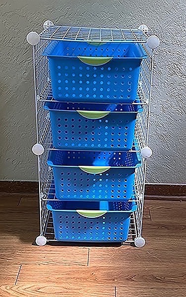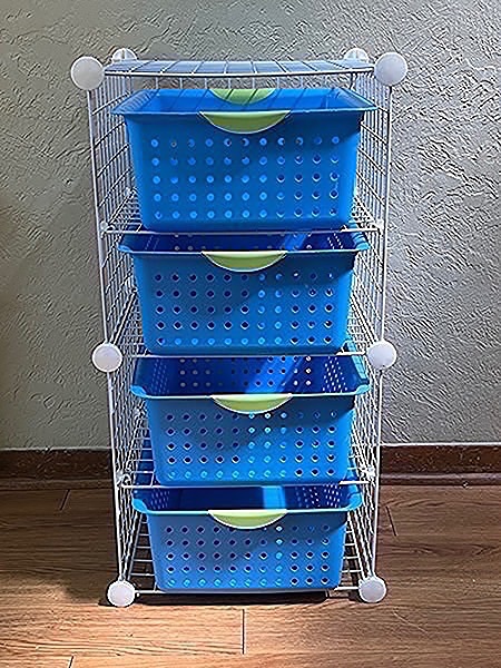 Organizer rack with four Sterlite blue plastic bins