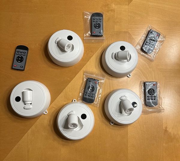 Selling for $8 each or all five for $30. Indoor spot lights with remotes. Battery operated with swivel heads for precise beam direction. Great for artwork, plants, etc. Can lay flat or hang on a wall/ceiling.