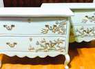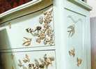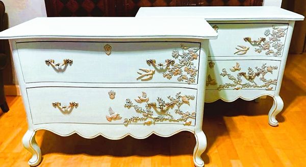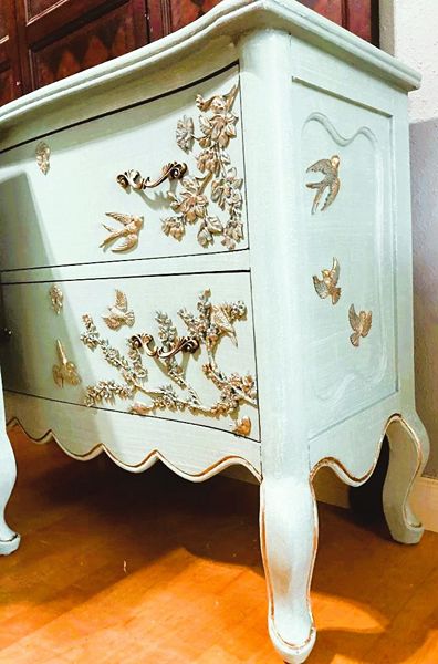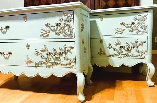 - We cleaned, filled, sanded, primed, added worn linen texture paint and glazed in layers, hand poured and applied moulds of birds and branches and florals, then, gilded and sealed for durability.