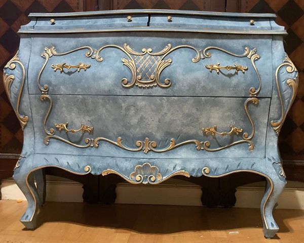 -We cleaned, filled, sanded, primed, painted and glazed in layers of blues, cream and grays then highlighted the details with gold gilding.